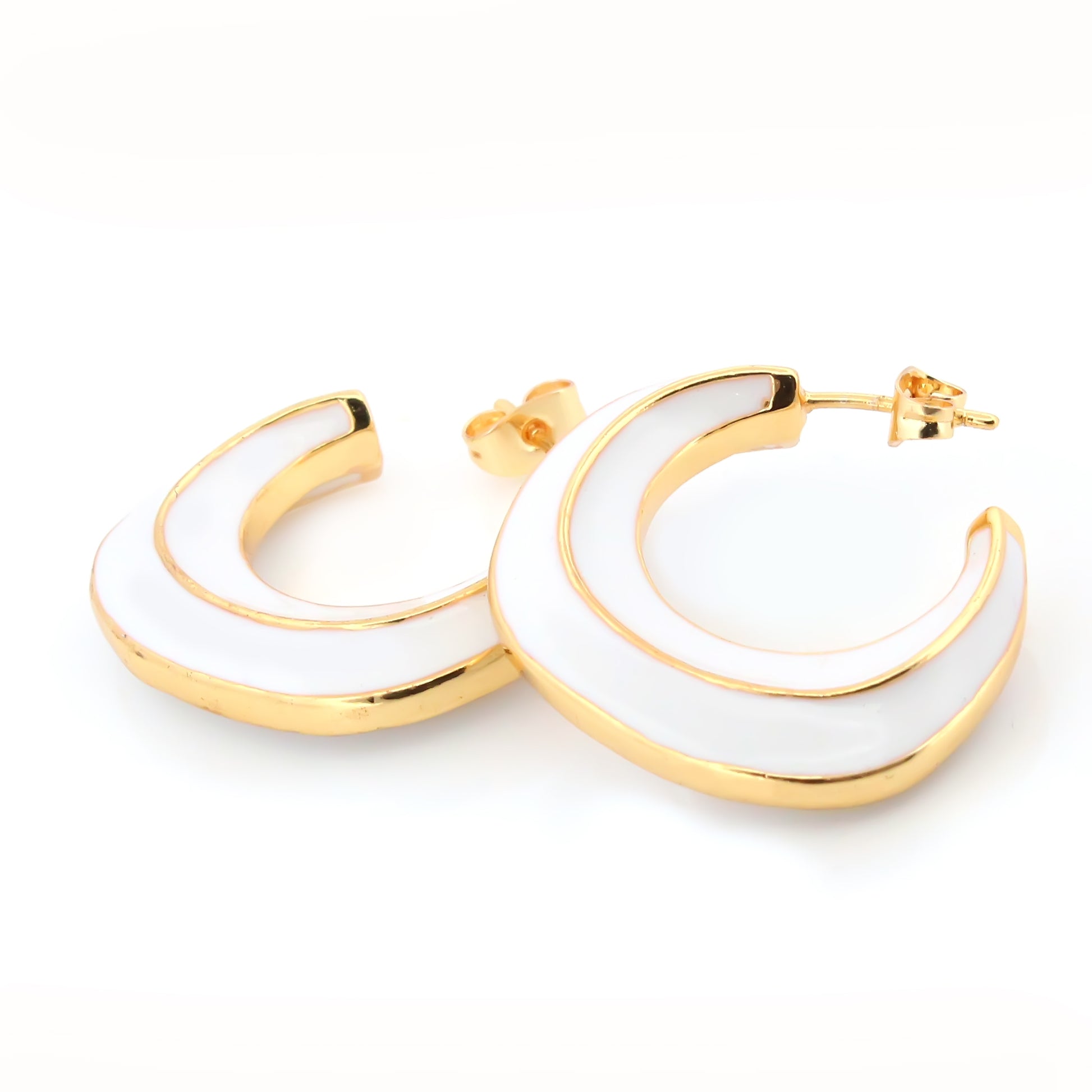 Sculpted in a sleek crescent silhouette, these half-hoops feature a smooth white enamel finish bordered by subtle gold accents. The contrast of ivory and metallic creates a look that’s both timeless and contemporary—versatile enough for day-to-night styling.