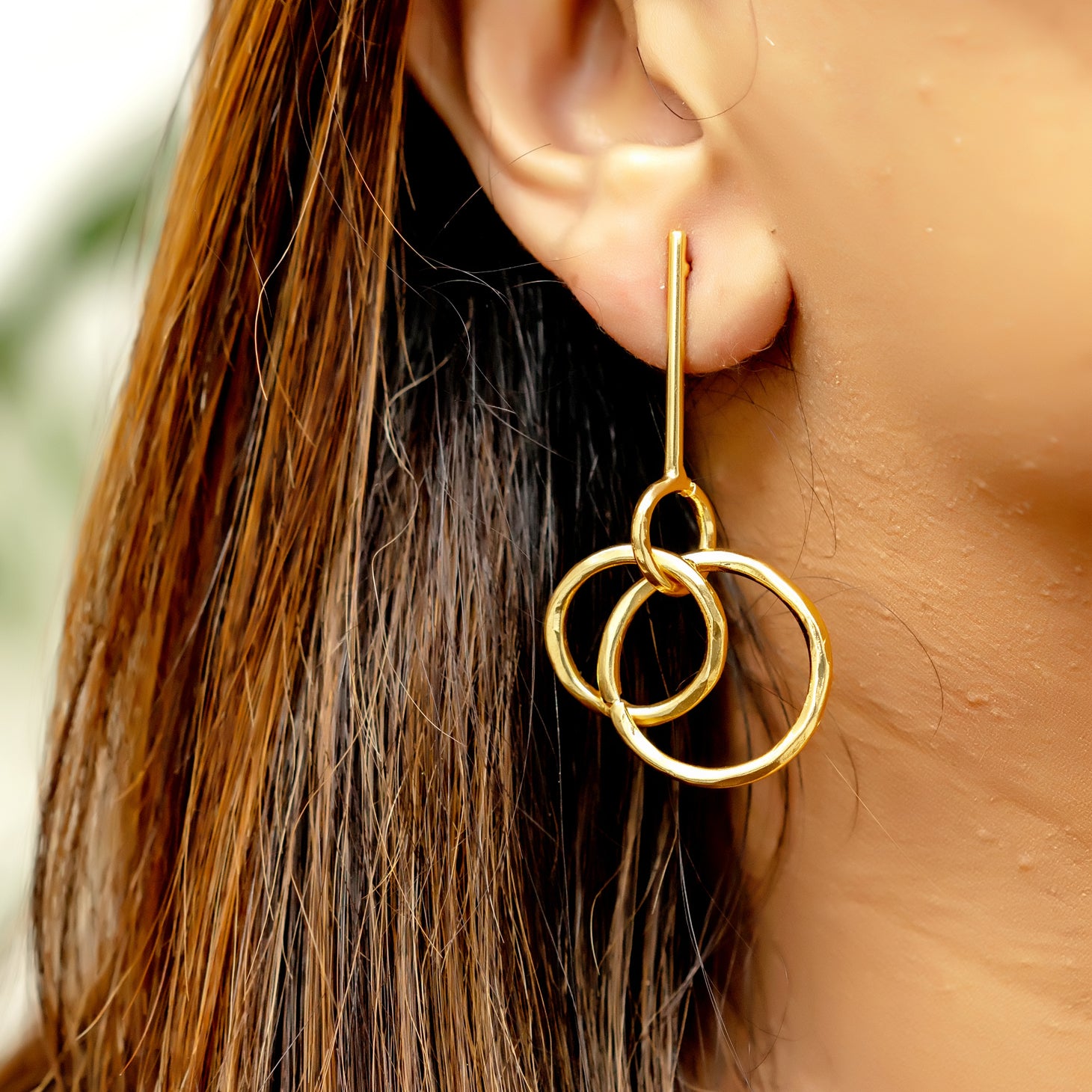 Crafted from gleaming, textured gold-toned metal, these earrings feature an interlinked trio of irregular rings, gently layered to create fluid motion and organic charm. The hammered finish reflects light like sun on water, while the elongated stud adds elegance and verticality to the silhouette.