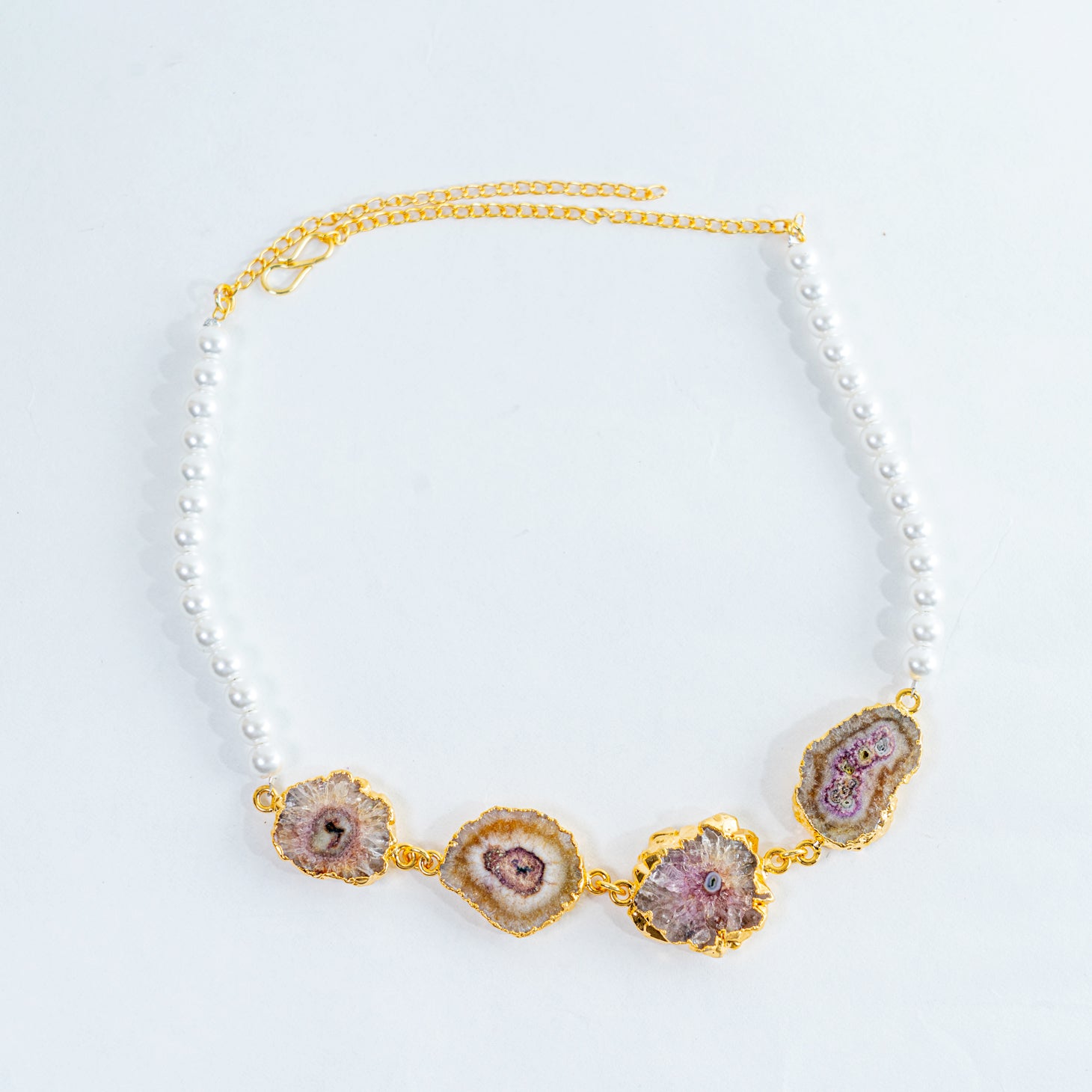Material: Natural solar quartz stone fragments, pearl beads, gold-toned metal chain