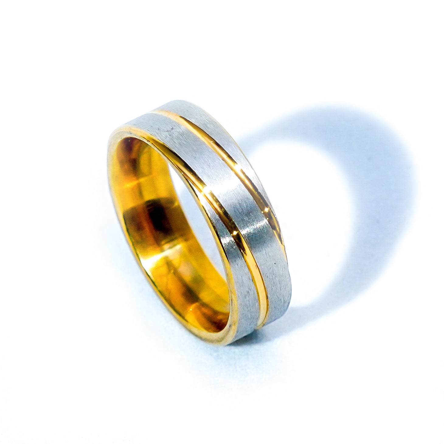 Crafted with a brushed silver-toned surface and edged with slim golden accents, this ring offers a sophisticated dual-tone finish. The matte center gives it a grounded elegance, while the gleaming borders bring just the right touch of contrast and clarity.