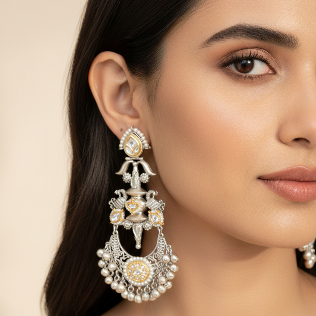 The design begins with a delicately framed kundan teardrop stud bordered with tiny pearls, flowing into an intricate mid-section adorned with sculpted swan motifs and traditional embellishments. The statement crescent base features ornate filigree work, finished with clusters of luminous pearl drops that sway gently with movement. Hints of warm gold accents against the silver-toned structure create a refined contrast that feels both royal and contemporary.