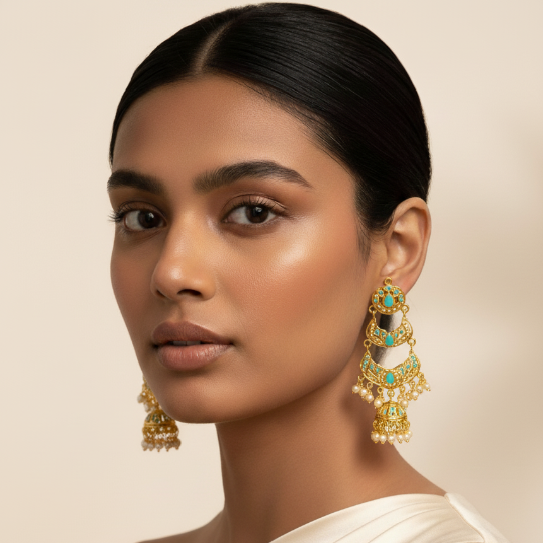 Each crescent tier gleams with turquoise enamel detailing, framed in radiant gold tones that echo the grandeur of royal design. The layered chandbali structure flows gracefully into a dome-shaped jhumka, accented with delicate pearl droplets that sway with every movement—an embodiment of festive charm and elegance.