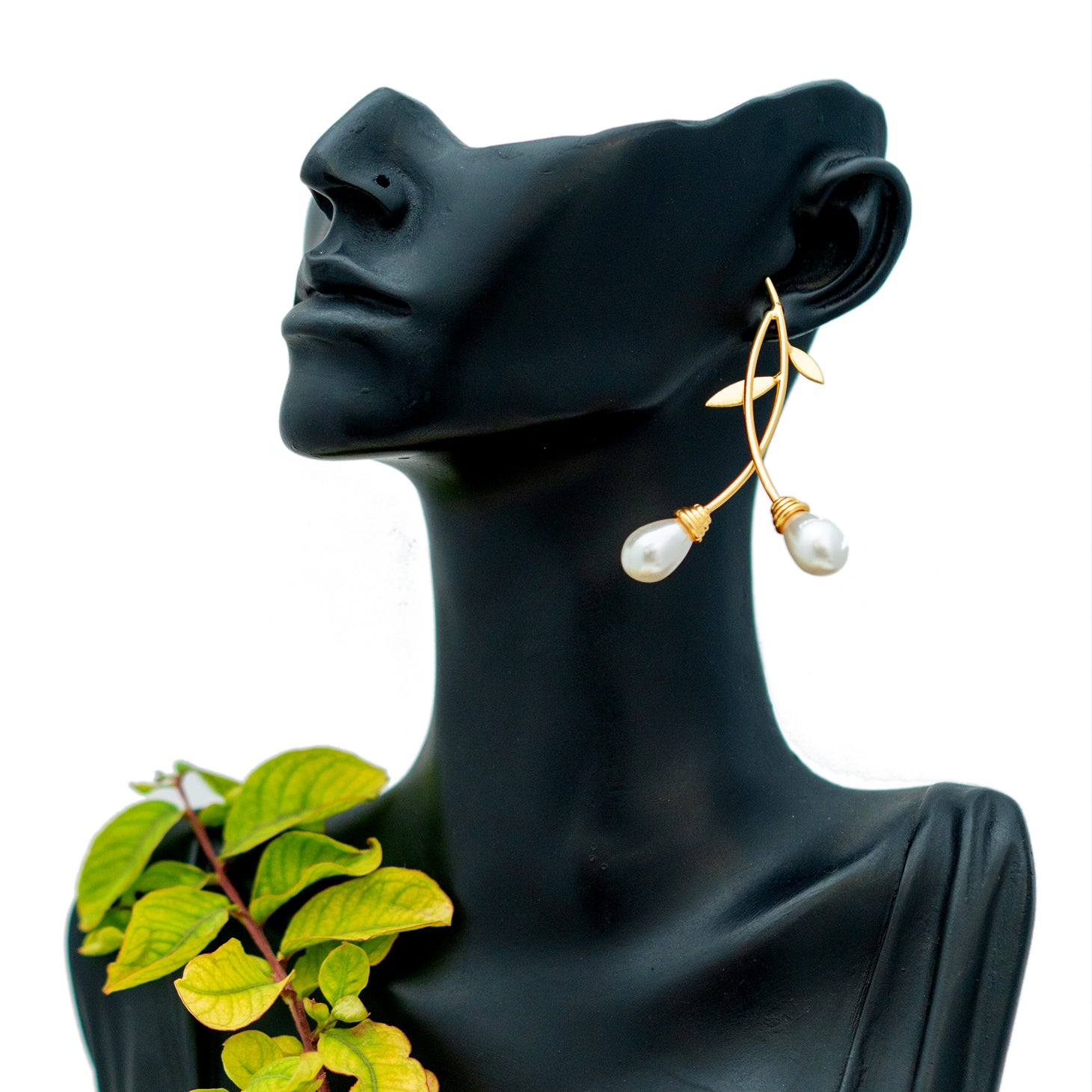 This botanical-inspired design features twin curved stems in radiant gold-toned metal, each adorned with a soft pearl teardrop and accented by two minimalist leaves. The composition is graceful and fluid, evoking the movement of a flowering vine gently swaying in the breeze.